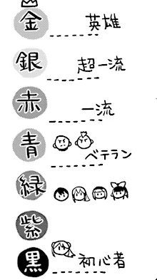 A diagram of how ranks function. pictured are Touya, Elze, Linze, Yae (All green-rank at the time), Yumina (black-rank), and two party members