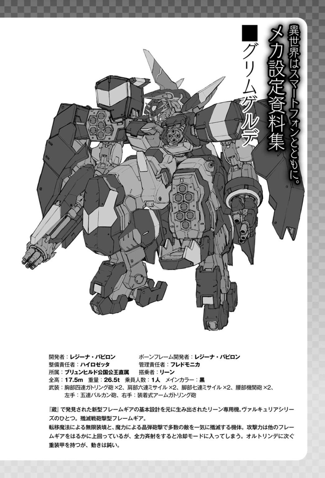 Grimgerde (グリムゲルデ,Gurimugerude?) is a Frame Gear dedicated to Leen. Its main color is black and it is a heavy duty bombardier type unit[12]. It is equipped with a large Gatling gun, capable of firing hundreds of bullets in matter of seconds, on its right arm , while the left arm is capable of firing bullets from its fingertips. By opening the armor on its chest, it can release another pair of Gatling guns that can fire at the same rate as the one equipped on its right arm. It is also equipped with head mounted Vulcan cannons and missile pods located in both its shoulders and its legs. It does not carry its ammo supply within its body but rather loads/reloads from a separate supply via 【Apport】. Its main purpose is heavy bombardment, artillery support and anti-air suppression. The unit cannot consecutively fire its armaments as it is required to enter a "cooling mode" after firing a full power volley for several minutes. Another disadvantage is that the unit draws a considerable amount of magic from the user, causing intense fatigue if used for extended periods.[16] Aside from the chest Gatling guns for a surprise attack, Grimgerde lacks close-quarters/melee combat weapons. As a result, it requires support from other Frame Gears for defense during its cool-down period and against enemies that get too close.