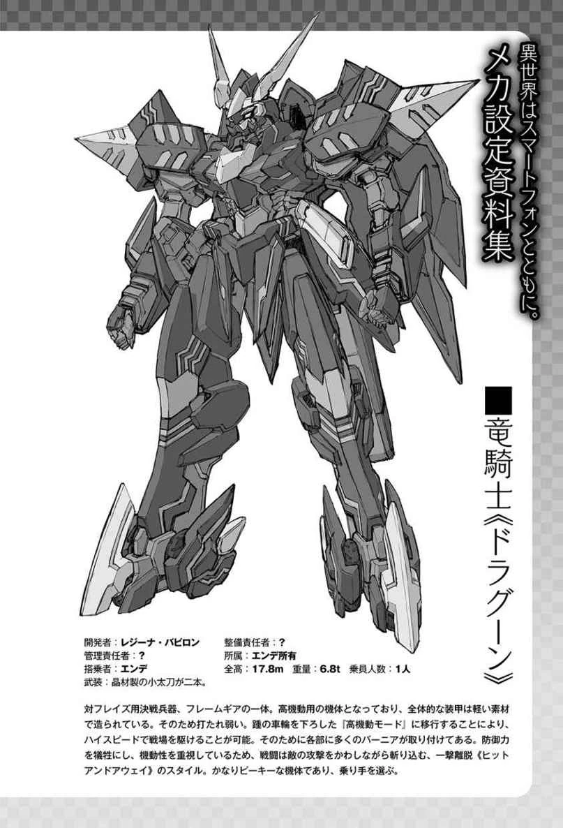 Dragoon (竜騎士,Doragūn?), is a red Frame Gear with a slim design. It has big wheels on the tip of both its heels, as well as thrusters on its back and both sides of the waist. It is the most agile Frame Gear, sacrificing defense and power and also difficult to control.[6] Because of its lack of power, it can not equip any heavy weapon[6] which is why it is equipped with two small swords (小太刀,kodachi?) made of phrasium (crystal material)[10]. This Frame Gear was given to Ende by Touya[10]. When Touya modified Ende’s Dragoon, he painted it black and white, in order to easily tell it apart from Elze Silhoueska's Gerhilde. Another Dragoon (albeit an old model Frame Gear) was also used by Lucia Rea Regulus before receiving her personal Frame Gear unit.[11]