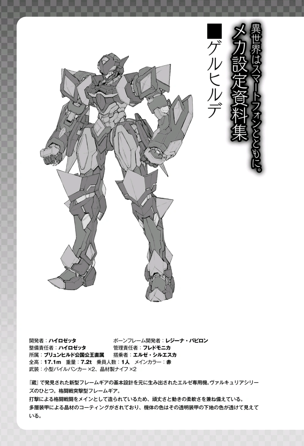 Gerhilde (ゲルヒルデ,Geruhirude?) is a Frame Gear dedicated to Elze Silhoueska. Its main color is red and it is a hand-to-hand combat assault type unit[12]. Gerhilde is the first exclusive FG build by High Rosetta and Fred Monica. This Frame Gear excels power and speed and has sturdy limbs to support this [13]. Gerhilde is equipped with pile bunkers made of phrasium on both hands[14]. Likewise, its armor is coated with phrasium for endurance that reacts with Elze’s「Boost」(which shifts Gerhilde into high power mode), engulfing it in a magical flame, while also boosting its speed and power[15]. It is also able to combine with Linze's unit, Helmwige, to act as a aerial support unit.[16]